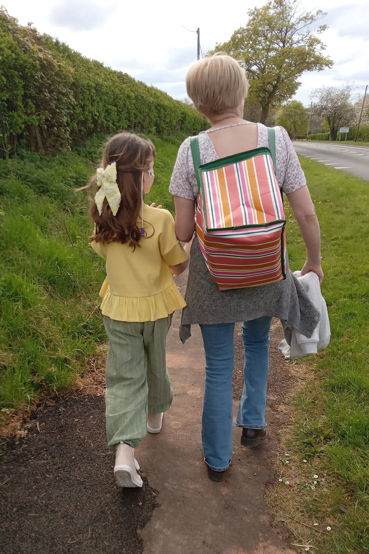 Child and adult walking along a roadside grassy verge, with a backpack and flower hair clip, representing support and guidance, young foundations, child welfare, family support, outdoor activity relevance.